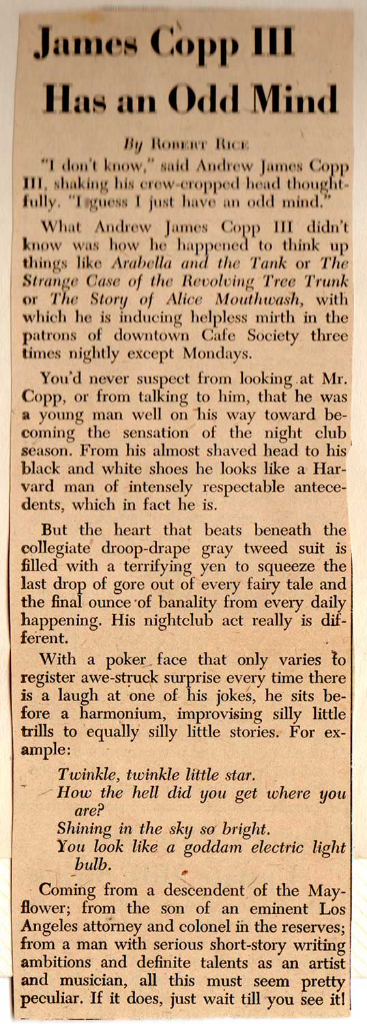 In the 1940's Jim had a nightclub act called "James Copp The Third & His Things". This was a popular act in New York City just before World War II (when Jim was drafted). This act was definitely risque & not for the kiddies! Here are some scrapbook items from that era.